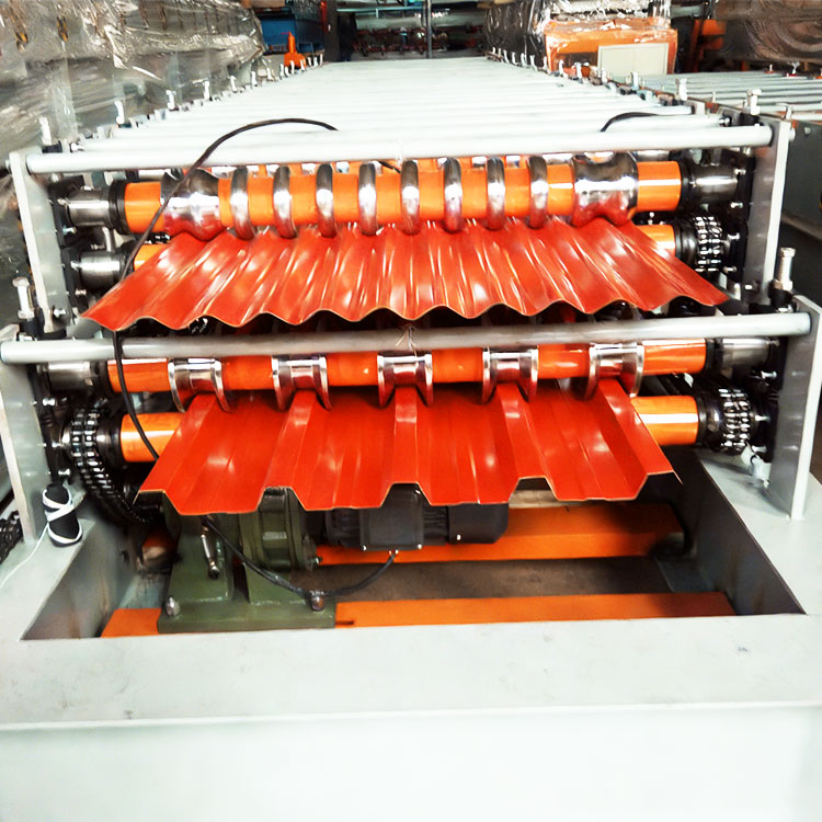 The double-layer tile press machine, also known as the double-mold tile press machine, double-layer color steel tile press machine, and double-layer roller forming machine, adopts a double-layer roller mold design. Its core advantage is that it can produce two different types of color steel tiles directly without changing molds, achieving dual uses with one machine. The equipment operates fully automatically throughout the process, integrating feeding, rolling, sizing and shearing. It features high processing accuracy, and the finished tiles are of regular shape, suitable for 0.3-0.8mm color steel plates, galvanized plates, aluminum single plates and other types of plates. It is widely used in the processing of roof and wall tiles for steel structure factories, prefabricated houses, warehouses and light steel villas. It occupies a small area, has low energy consumption and high production capacity. It is the preferred high-efficiency forming equipment in the field of building materials processing.